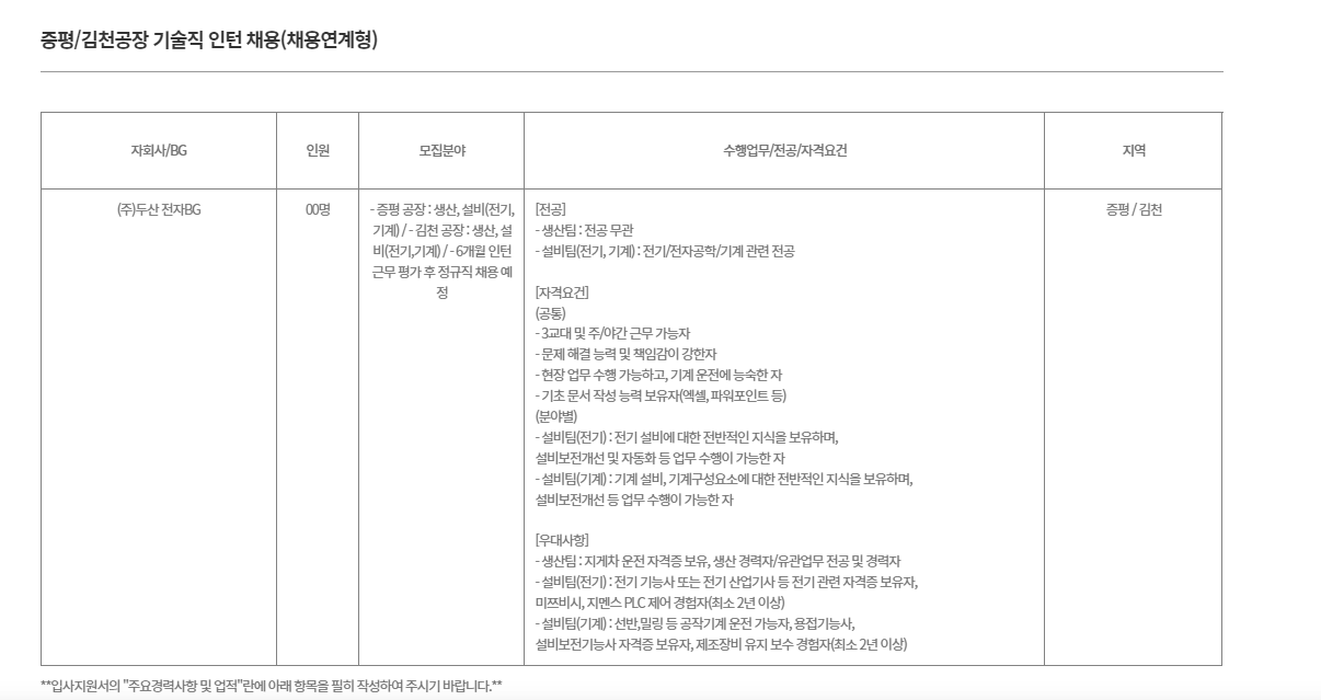 안녕하십니까. (주)두산전자사업 김천공장 요청으로 아래와 같이 기술직 채용 안내를 드리오니 지역 인재분들의 많은 지원 바랍니다.