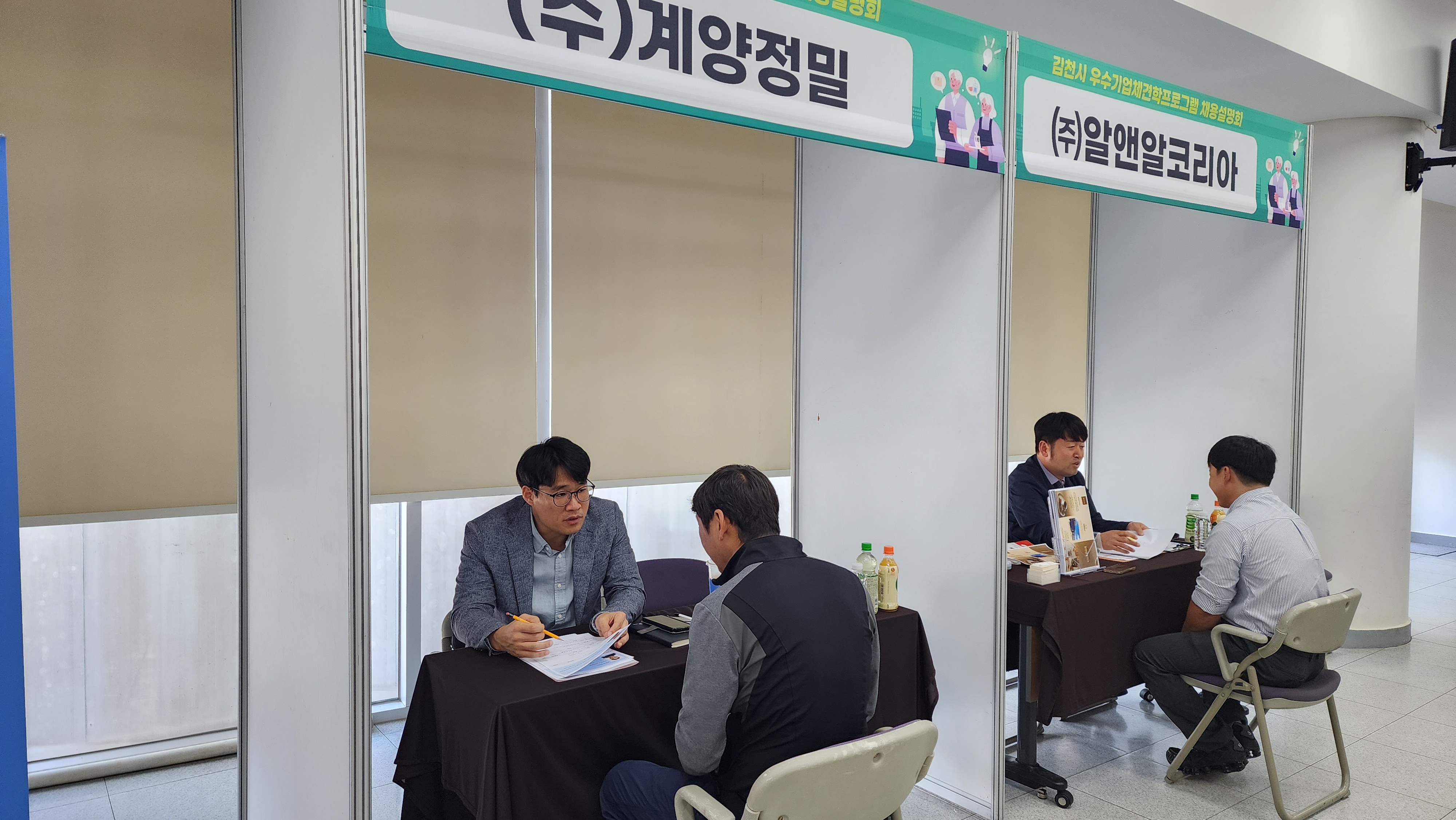 주요참여기업들로는 코오롱이앤피(주), 코오롱생명과학(주), ㈜우진산전, ㈜계양정밀, ㈜태동테크, ㈜알앤알코리아 등 관내 우수기업 6개사가 자세한 기업설명과 함께 면접도 진행했다.